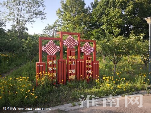 五一假期,舜耕山森林公園里游人增多。漫步路邊,只見各色鮮花迎風綻放,鮮花叢中,立著一塊設計美觀的社會主義核心價值觀宣傳牌。游人可以一邊散步,一邊觀看社會主義核心價值觀內容。(記者 李鈞 攝)