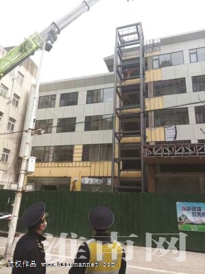 (記者 王偉 攝影報道)近日,田家庵區城管局對于一處未經審批,私自加裝的外置電梯進行了拆除,及時制止了違法行為。