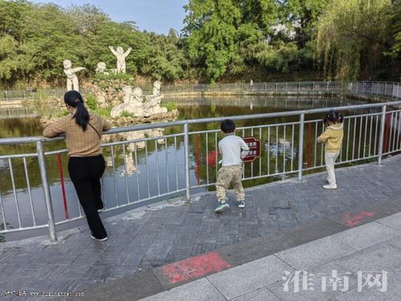 “五一”假期,淮河早報、淮南網記者在洞山公園內看見,一些孩子在標有“水深危險 注意安全”的水池邊用網撈魚,既不文明也不安全。 (記者 攝)