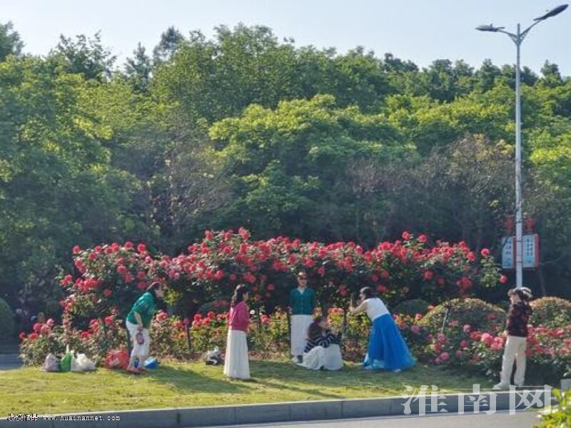 “五一”假期,淮河大道的隧道南側馬路中間綠化帶內,一棵棵形似“棒棒糖”的月季花樹開得絢爛奪目。淮河早報、淮南網記者看到,許多游客為了近距離與花樹合影,肆意穿過快車道,走進綠化帶內,踩踏草坪、拉扯樹木。 (記者 攝)