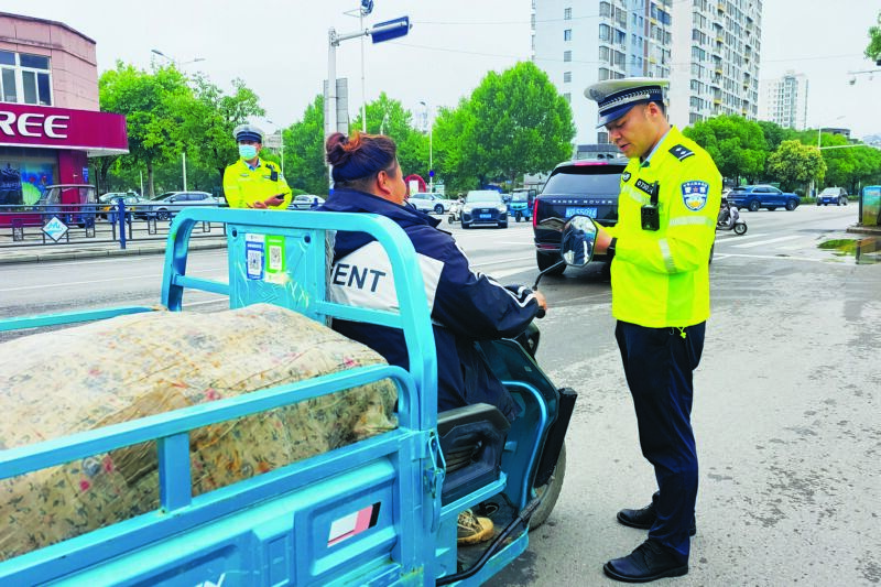 6月2日,市公安局交警支隊田家庵二大隊民警在湖濱路查處騎行兩三輪電動車不佩戴安全頭盔等違法行為。端午節假期,市公安局交警支隊在全市范圍內開展了集中查處交通違法行為專項行動。 (記者 蘇國義  攝)