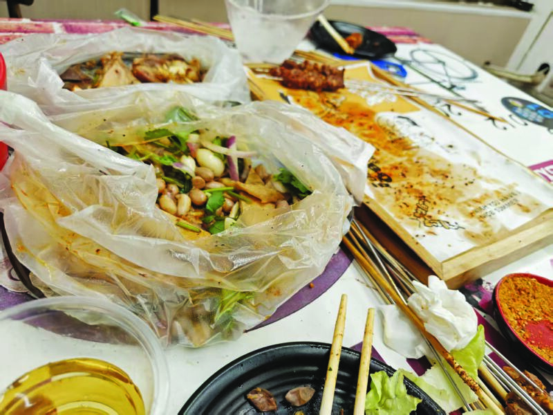 端午假期,記者走訪我市部分餐廳、夜市大排檔發現,絕大多數消費者能做到文明用餐,但也有個別市民存在“舌尖上的浪費”。圖為在一家大排檔,食客已離去,桌面上卻殘留了不少食物。(記者  攝)