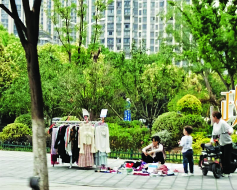端午假期,記者在田家庵銀鷺萬樹城小區附近的一處街頭游園內看到,有商販在人行通道上擺攤設點,不僅影響市民出行,也有損游園整體美觀。(記者  攝)