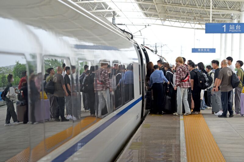 10月8日,淮南東站,旅客有序排隊(duì)乘車。當(dāng)日,全國鐵路迎來返程客流高峰,鐵路部門精準(zhǔn)投放運(yùn)力,落實(shí)便民利民惠民舉措,努力滿足旅客出行需求。