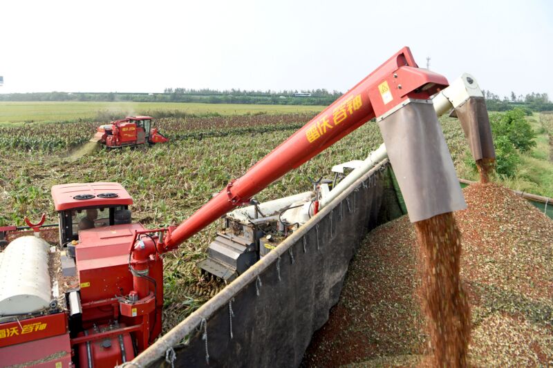 連日來,我市抓住晴好天氣,積極組織機械搶收秋糧,確保顆粒歸倉。圖為淮南農場組織人員機械化搶收高粱。