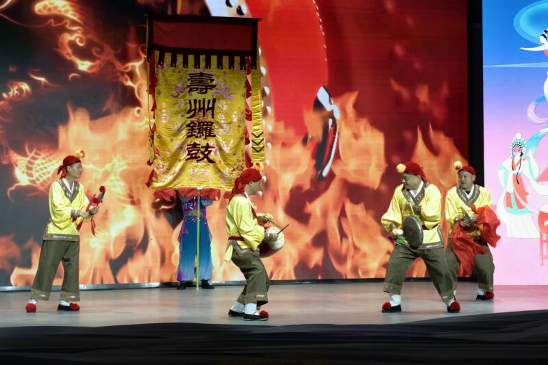 整場演出地方特色濃郁。省級非遺壽州鑼鼓《喜鵲登枝》氣勢磅礴,國家級非遺花鼓燈《扇風》靈動歡快,好戲相繼登場,集中展示了淮南深厚的文化底蘊。