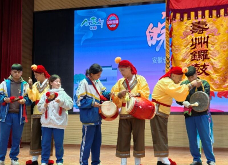演出現場,淮南文旅推薦官楚小南與師生們的熱情互動瞬間點燃了全場氣氛。在主持人的帶領下,全場齊聲高唱《國家》,激昂的歌聲抒發了對祖國的熱愛;省級非遺壽州鑼鼓《喜鵲登枝》的表演則成為整場演出的亮點。高二學生玉蘇普江·納斯爾江和幾位同學自告奮勇登臺,在傳承人手把手指導下學習鑼鼓技藝,他興奮地稱,“壽州鑼鼓的節奏感很特別,這種需要團隊協作的表演形式很有感染力。”