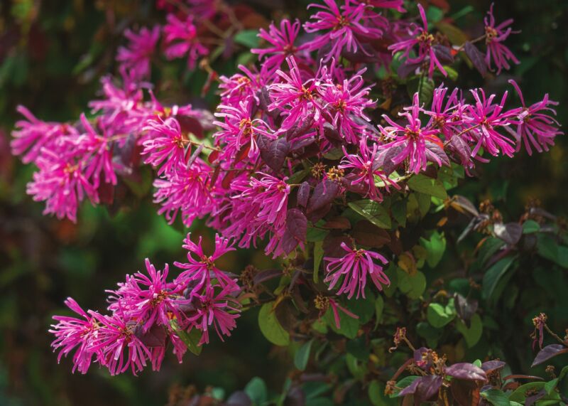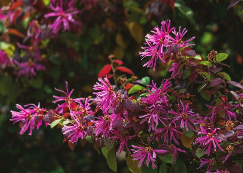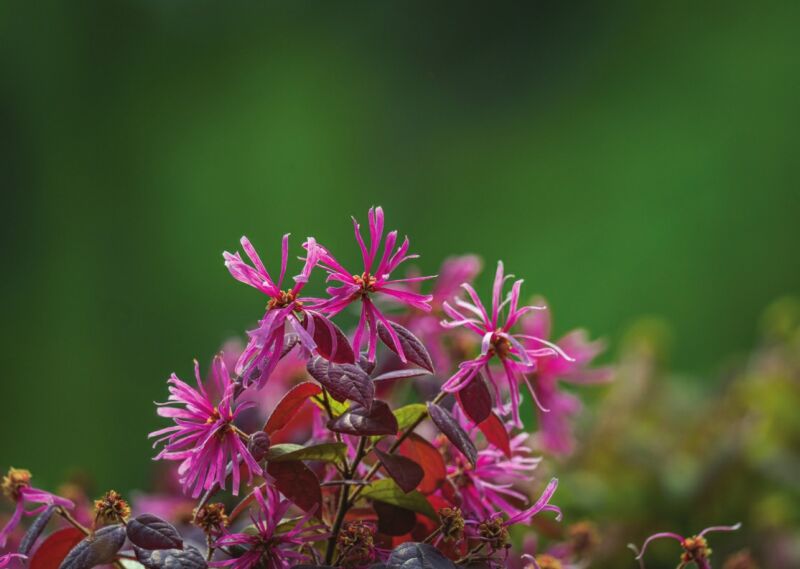 霜降的淮南“花代”——紅花檵木是金縷梅科檵木屬常綠灌木,花朵盛開時,3-8朵帶狀花瓣的小花簇生在枝梢頂端,花開滿樹,極為壯觀。紅色如團團火焰,熱情怒放;紫色如絲綢輕舞,嬌美多姿;白色如蟬翼菲薄,雪掛枝頭。向陽丘陵和山地是檵木非常適宜的生長環境,淮南主城區中央的低矮群山中,檵木植株隨處可見。《淮南市城市綠化工作導則(試行)》將紅花檵木作為城市綠化的推薦品種,對苗高、冠帽和種植密度都加以規范。按照《導則(施行)》標準,洞山、五一、淮河、老龍眼濕地等公園都栽植了成片的紅花檵木,市區主干道重要交口的草花改造也增加了紅花檵木。紅花檵木春秋兩季開花,現在正當秋季盛花期九十月份,特將其確定為寒露時節的淮南代表性花卉。