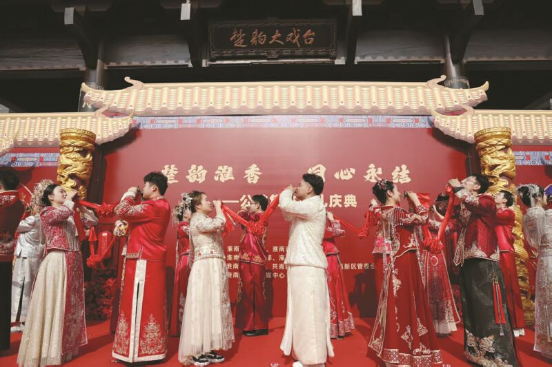 11月1日上午,在春申里文旅街區,一場由市民政局、市婦聯主辦,市委宣傳部、市委社工部、市總工會、團市委、淮南高新區協辦,市新聞傳媒中心承辦的集體婚禮浪漫舉行。12對新人身著傳統禮服,在親友與社會各界的見證下,共許白首之約,共同鐫刻同心永結的幸福時刻。整場儀式以楚文化的典雅氣韻為基調,融匯淮河文明的包容精神,倡導“文明簡約、傳承文化、家國一體”的婚禮新風。