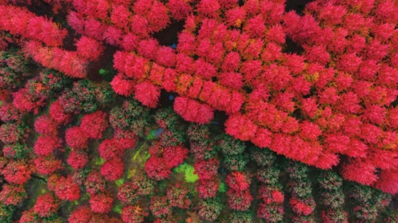 立冬后,毛集實驗區的紅楓林迎來最佳觀賞期,漫山遍野的緋紅如同熱烈的火焰,將天地渲染成一幅壯麗的油畫。游客們穿梭其間,或漫步拍照,或孩童嬉戲,盡情沉浸在這片初冬盛景之中,感受季節流轉的靜好。