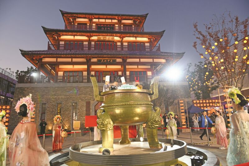 淮南主會場現場,以楚大鼎造型大鍋熬制的淮南牛肉湯可以滿足5000余名游客、市民共同免費品嘗。