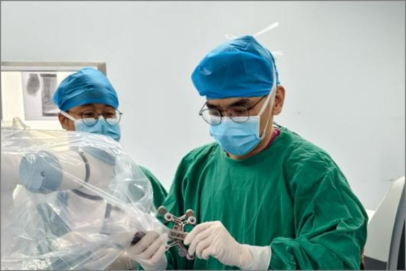 醫生借助骨科手術機器人開展精準手術(圖片由淮南新華醫院提供)