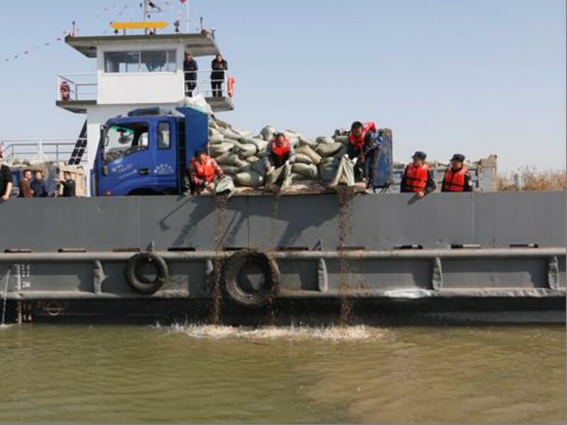 此次人工增殖放流活動為淮南港3號水上綜合服務區項目所開展的生態補償,活動地點位于平圩淮河大橋上游的原連崗碼頭處,該水域屬于淮王魚保護區實驗區。為確保安全,此次人工增殖放流活動租用了大型渡運船。因底棲生物貨源不同,渡運船先后從淮河北岸及南岸載運裝有底棲生物的貨運車,共計7輛,在船上安置穩妥。