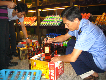8月22日晚8時許,執法人員兵分五路直奔學院路、國慶路、龍湖路等處的市內主要娛樂場所展開行動。記者跟隨一組執法人員,前往國慶路的一些娛樂場所進行了檢查。進入國慶中路一家大型娛樂場所后,執法人員立即要求老板出示營業執照,查看完畢后向其表明了來意,隨即對吧臺、吧臺附近的小倉庫進行了檢查,并未發現異樣。隨后,執法人員又對各樓層展開了逐層檢查。但在這家娛樂場所里并未發現“問題酒”。