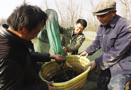 12月26日上午,鳳臺縣桂集鎮白塘村村民繆先生正在自家參股的合作社泥塘里收獲養殖的泥鰍。據了解,鳳臺水富里水產養殖專業合作社聯合周邊20多戶農戶一起養殖泥鰍,鎮里數百人依靠泥鰍致富?娤壬嬖V記者,冬季是泥鰍市場的空白期,東亞市場上泥鰍供不應求,他們合作社每年冬季出口泥鰍近6萬斤,熱銷韓國、日本,填補市場空白,出口的泥鰍價格均高于本地市場價,高達18-20元每斤。