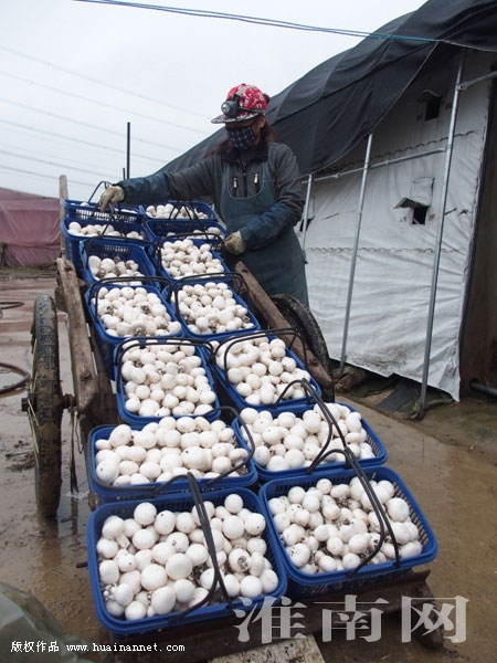 圖四:豐收的頭茬雙孢菇正在轉運。