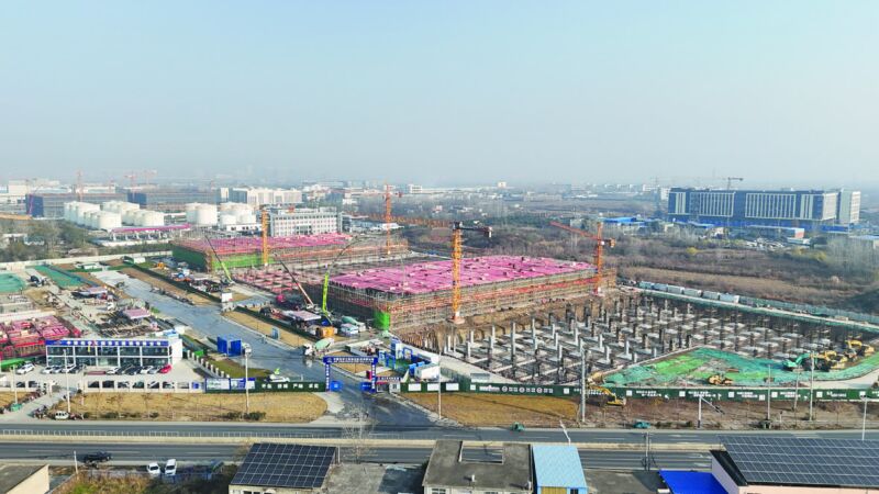 圖為曹庵鎮(zhèn)鄉(xiāng)村振興生態(tài)智慧產(chǎn)業(yè)園項(xiàng)目建設(shè)現(xiàn)場(chǎng)鳥瞰。 (記者 張明星 攝)