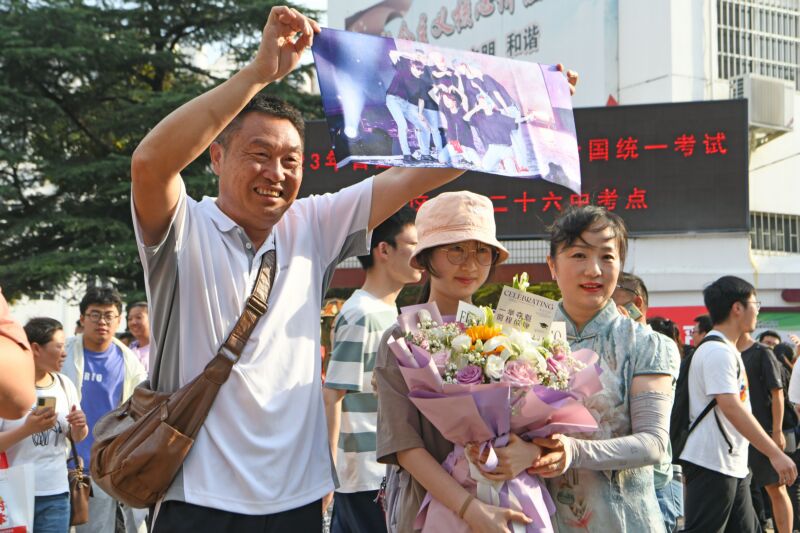 父母迎接考生走出高考考場,送上鮮花和偶像畫。