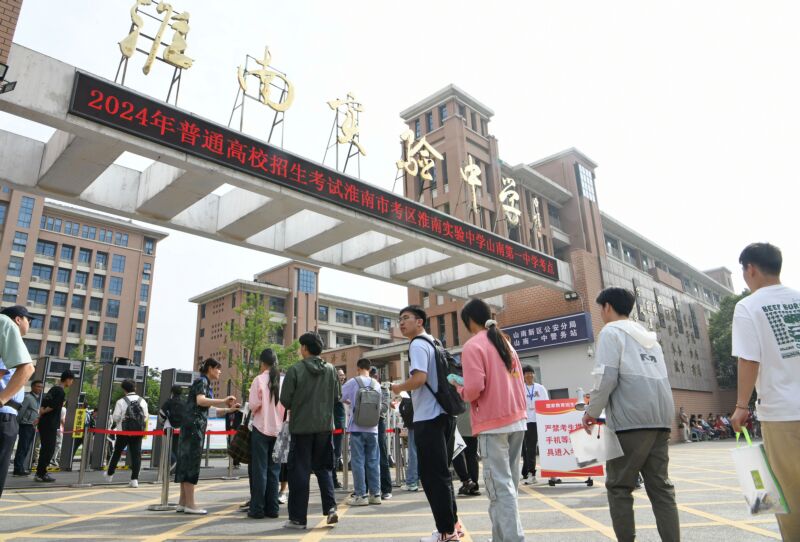 考生有序通過安檢進入考場。
