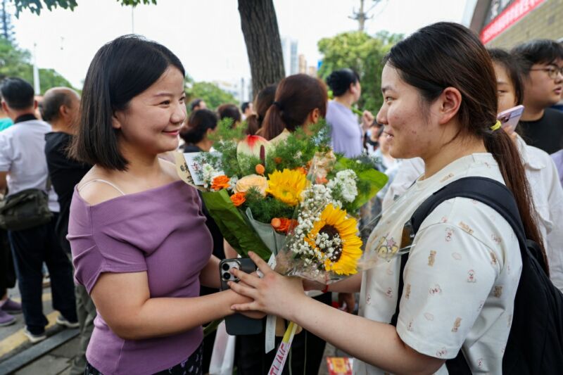 6月7日,一位學(xué)生家長(zhǎng)用鮮花迎接走出考場(chǎng)的孩子。