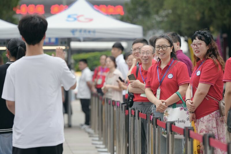 6月7日高考首日,在淮南一中考點,老師們祝福每一位考生落筆生花、考出佳績。