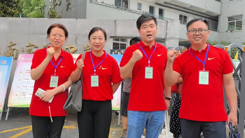 (記者 李嚴(yán))6月7日上午,2025年高考拉開帷幕。在龍湖中學(xué)考點(diǎn)外,一群身著“定制戰(zhàn)袍”的送考教師成為現(xiàn)場亮麗的風(fēng)景——四位教師身著紅色送考服,佩戴工作證件,為考生送上深情祝福。