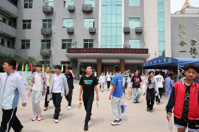 6月14日,為期三天的2025年安徽省初中學業(yè)水平考試開考。我市共有40362名考生報名應試,他們將分布在27個考點、1348個考場參加考試。圖為6月15日中午,參加完數(shù)學科目考試的學生走出考點。