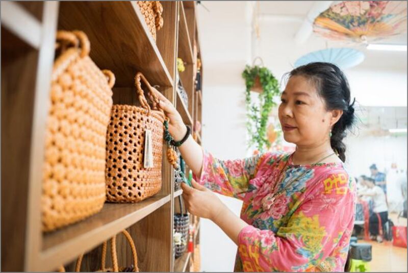 湯多榮選擇主動(dòng)求變。她慧心獨(dú)運(yùn),將傳統(tǒng)藤編技藝精巧融入現(xiàn)代生活經(jīng)緯:設(shè)計(jì)制作別致玲瓏的藤編手袋、精巧時(shí)尚的掛件飾品,讓古樸的“筋骨”披上輕盈的“新裝”。“藤編也是一種創(chuàng)作,技法手法不同,花紋樣式不同,給人的美感就不一樣。”