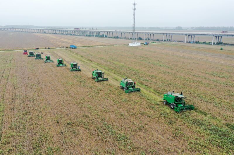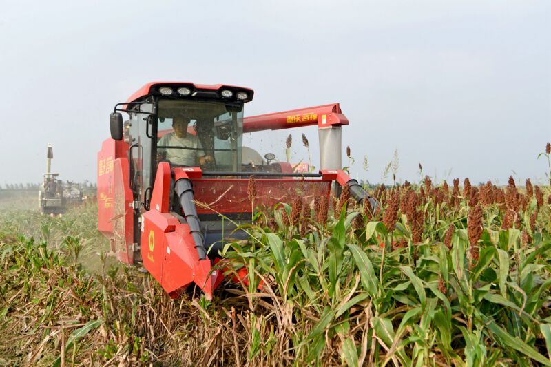 10月8日,淮南農場組織機械搶收高粱。(記者  陳彬 攝)