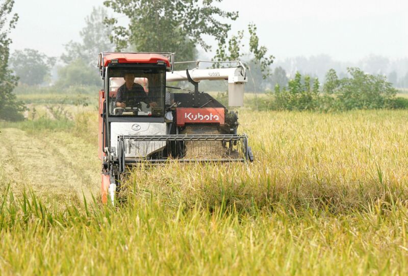 10月12日,潘集區平圩鎮農民駕駛農機在地里收割水稻。(記者 蘇國義 攝)