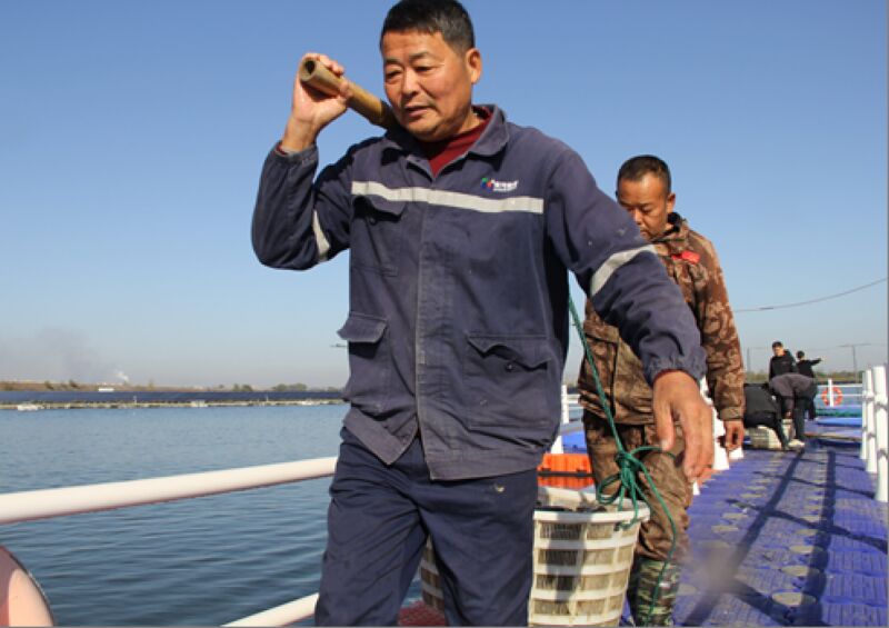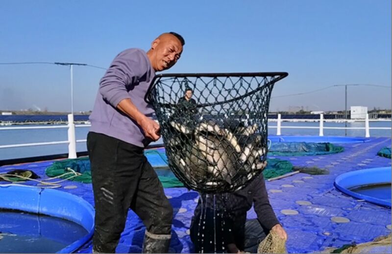 淮南市采煤沉陷區生態養殖牧場漂浮圏桶淮王魚養殖基地里,漂浮在水面上的8個大型圈筒陸續進入收獲季,漂浮圈筒直徑4米,深3.5米,圈筒內水流涌動,淮王魚、黃金鯽、羅非魚、瓦氏黃顙等多個品種的魚兒活力十足,漂浮圏桶養魚“生態漁業示范模式”獲得成功。在溫暖的陽光照射下,魚鱗泛著光,人們臉上洋溢著收獲的喜悅。