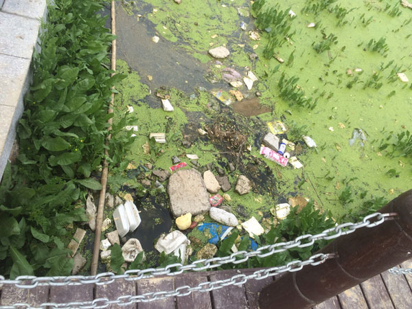 園區內的草坪遭到人為破壞,游人隨手拋棄的垃圾成堆,一些垂釣者也留下不文明行為,周末還有人在此擺攤設點