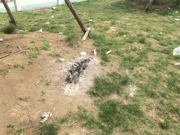 除了這些成品的包裝盒、包裝袋以外,在山南中央公園里還有燒烤遺留下的物品。在靠近沙灘的草地上,淮河早報、淮南網記者看到多處草地上散落著竹簽、酒瓶和碎骨頭等,明顯是燒烤后留下的,而在一棵樹旁還有遺留下沒有燒完的木炭,周圍的草地已經是光禿禿的了。在這片草地上,淮河早報、淮南網記者大概地數了數,有近10處燒烤點。