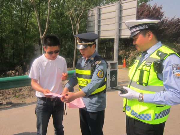 圖:執(zhí)法人員向在合淮阜高速淮南西出口停車的駕駛員進(jìn)行宣傳勸離