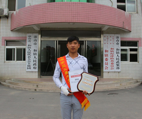 一個(gè)95后淮南小伙,從看到有人落水到一個(gè)猛子扎入水中救人只用了短短幾秒鐘的時(shí)間,他當(dāng)時(shí)的內(nèi)心世界又是怎樣的獨(dú)白?日前,淮河早報(bào)、淮南網(wǎng)記者在三和鎮(zhèn)見到了這位見義勇為的帥小伙鄒四蓓,和上海市頒發(fā)的那份沉甸甸的榮譽(yù)。