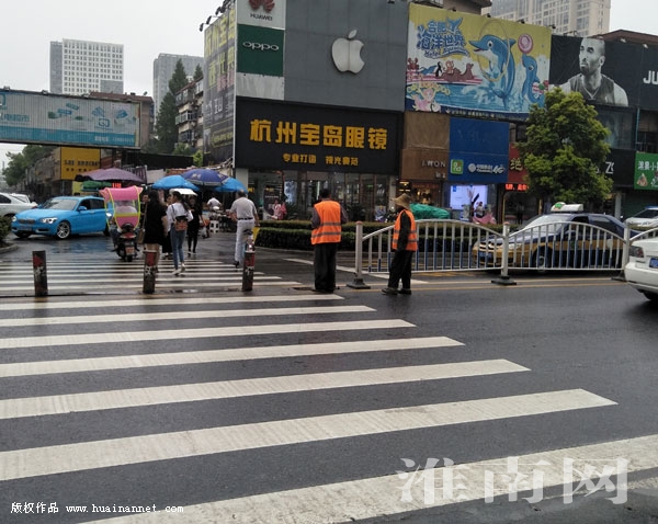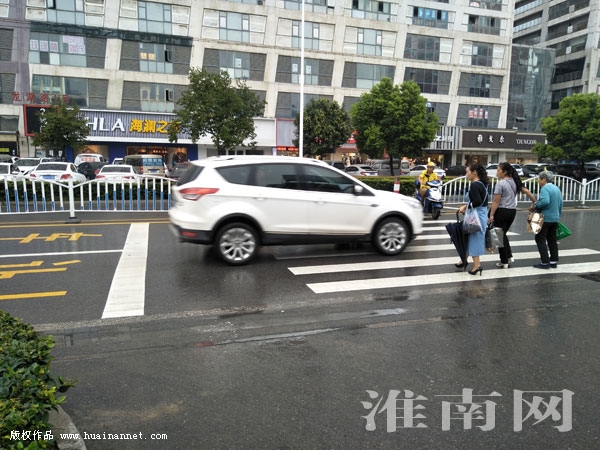 9月10日是周末,雖然下著雨,但龍湖路上依然有不少市民逛街,下午3時30分至4時30分,淮河早報、淮南網記者一直在龍湖路商之都門口的斑馬線上觀察。