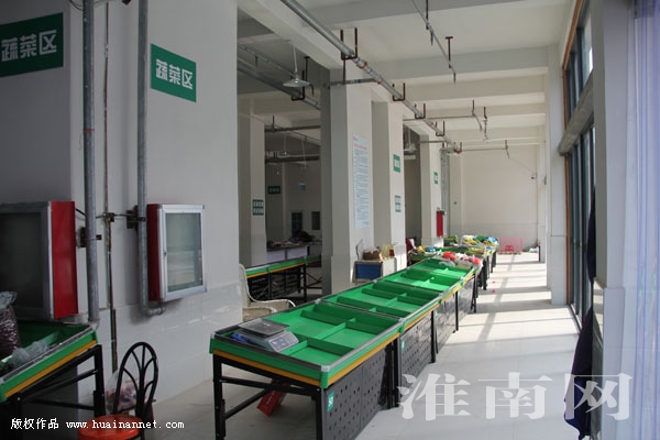 得知這一信息后,淮河早報、淮南網記者于2月7日上午10時左右來到西湖春天小區。在小區西門的室內菜市場內,近百個全新的鋁合金攤位整齊排列,蔬菜區、肉食區、熟食區和水果區十分規范,白色的瓷磚地面顯得潔凈明亮,雖然室外氣溫已經到零下,但是室內卻沒有一絲寒意。然而這樣配套設施完善的室內菜市卻冷冷清清,大多數攤位都是空置的,只有零星幾個商販在這里經營,整個室內菜市場內沒有一個前來買菜的居民,顯得十分空蕩。