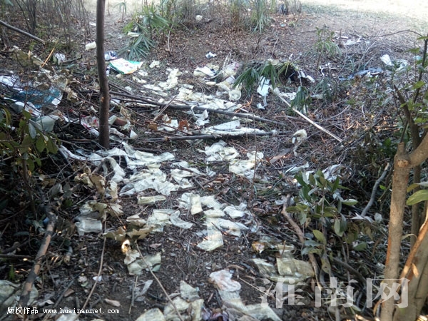 淮河早報、淮南網記者沿淮南一中東圍墻邊的人行道自南向北走了一趟,果然看到校園內的草坪上、樹叢間散落著大量的諸如塑料袋、一次性飯盒、筷子、飲料瓶、紙杯以及剩飯剩菜等形形色色的生活垃圾,有些垃圾已經匯集成堆。還有一些粘滿油污裹著剩飯剩菜的塑料袋懸掛在樹枝上。