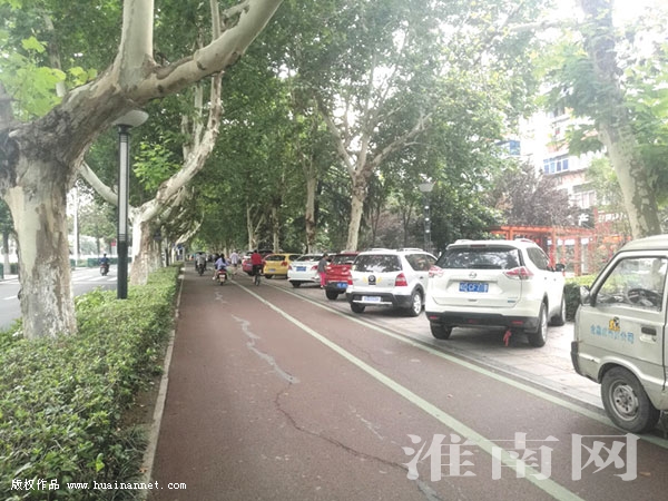 在廣場路兩側的停車位上,也存在同樣的情況。淮河早報、淮南網記者沿著廣場路觀察,有的一連多輛車車頭或車尾占據旁邊的車位停放。