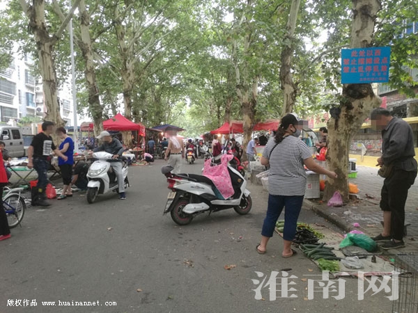 從路口向東,一直到老龍眼水庫(kù)西側(cè),整條道路上都可以看到賣菜、賣水果等各種攤點(diǎn)。有的在路邊支個(gè)攤子,有的干脆把物品直接擺到路面上叫賣,道路處于擁堵?tīng)顟B(tài)。在路邊一棵梧桐樹(shù)上,淮河早報(bào)、淮南網(wǎng)創(chuàng)城報(bào)道組記者看到懸掛著一塊牌子,上面寫著“此處以西,禁止擺攤設(shè)點(diǎn),禁止亂停亂放”。不過(guò),淮河早報(bào)、淮南網(wǎng)創(chuàng)城報(bào)道組記者看到,“此處以西”,擺攤設(shè)點(diǎn)、占道經(jīng)營(yíng)、出店經(jīng)營(yíng)、亂停亂放現(xiàn)象比比皆是。